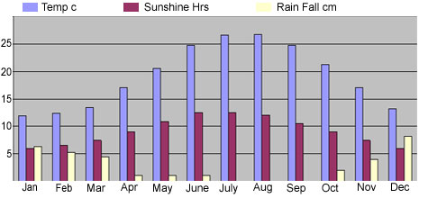 Average daytime temperatures range from the mid 50s (12C) in January to the 90s (mid 30sC) at the height of summer. With low humidity and an ever-present on-shore breeze you will always feel comfortable. Rain is most unlikely between April and October, indeed even clouds are a rarity!